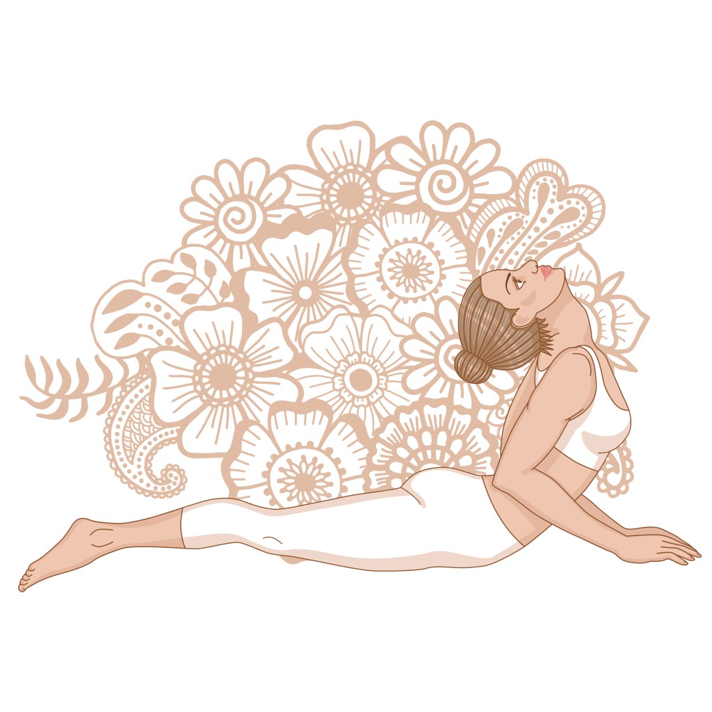 Start in table top pose then raise up (inhale) on your knees. Dangle your fingertips on the floor next to your torso. Your knees should be hip width apart and feet tops flat on the floor. Breathe out and reach back with both hands to touch your heels, (if you can’t reach your ankles dangle the hands towards the ankles) pinching your shoulder blades together. Push your chest out as you slightly arch your back and look up to the sky.