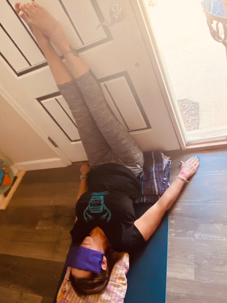Any time you are stressed out or feeling anxious legs up the wall or chair is a great way to calm down! This pose is associated with the Root chakra and is very grounding. Place your mat perpendicular to the wall. Have a blanket for your head and bottom. Lay down and place your bottom against the wall with your legs up the wall. Use an eye pillow if desired. Breathe in and out through your nose, concentrating on the present moment. Stay in this pose for 4-5 minutes or longer if desired. To come out of this position remove your eye pillow and blankets then slowly push yourself up to a seated position.